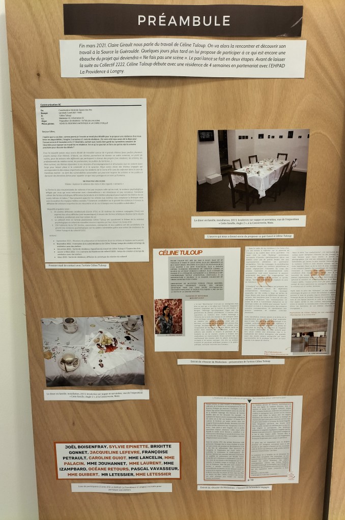 NE FAIS PAS UNE SCENE est une résidence de la saison culturelle 2021/2022 en partenariat avec l’EHPAD La Providence à Longny ; avec le pari lancé « Déjouer les insultes et les silences » . Une deuxième partie théâtre initialement prévue en 2021 a été reportée en 2022. Les enjeux étaient à travers une pratique manuelle d’exprimer et de dénoncer les violences verbales et psychologiques trop souvent banalisées envers les publics vulnérables.