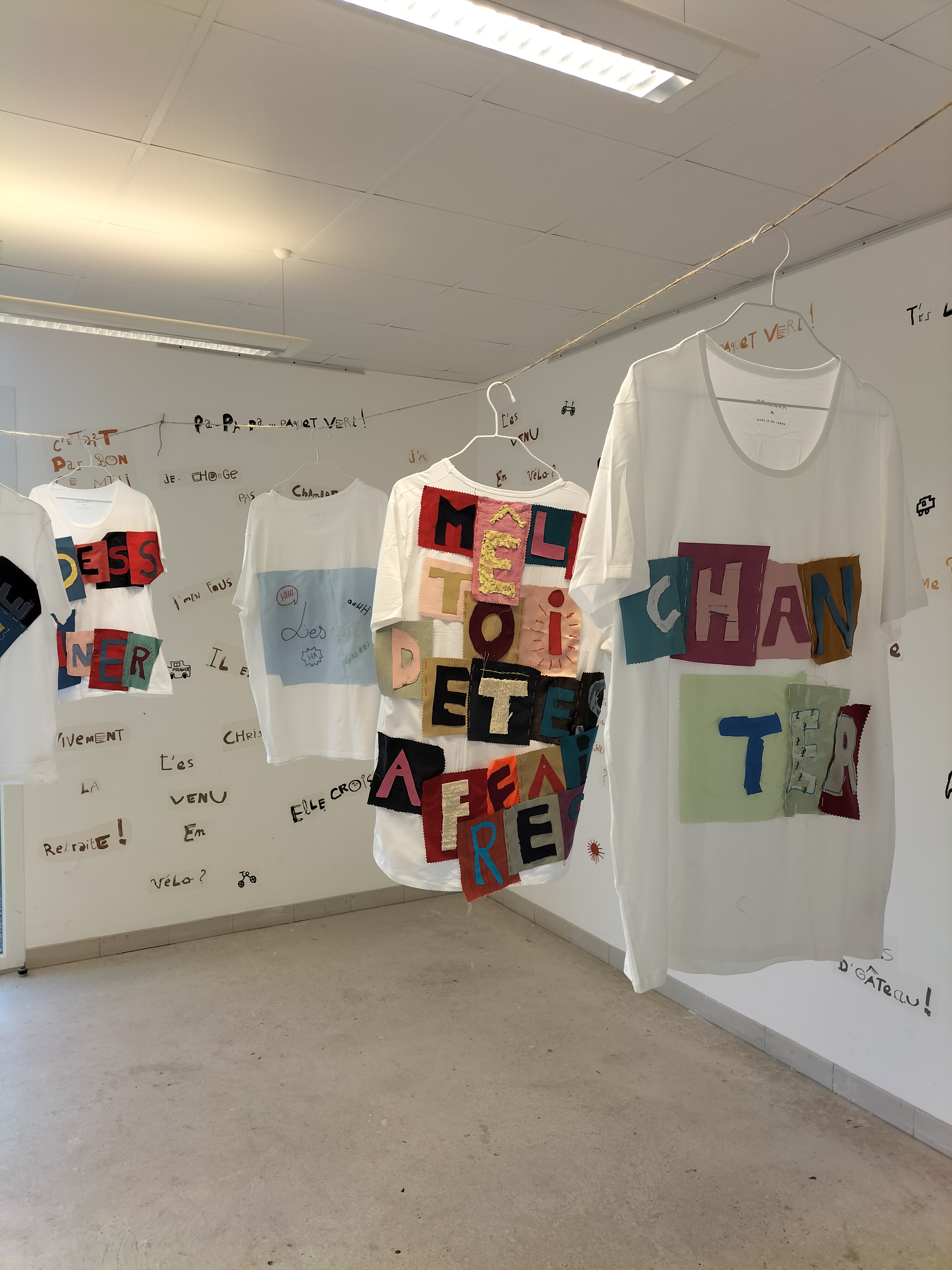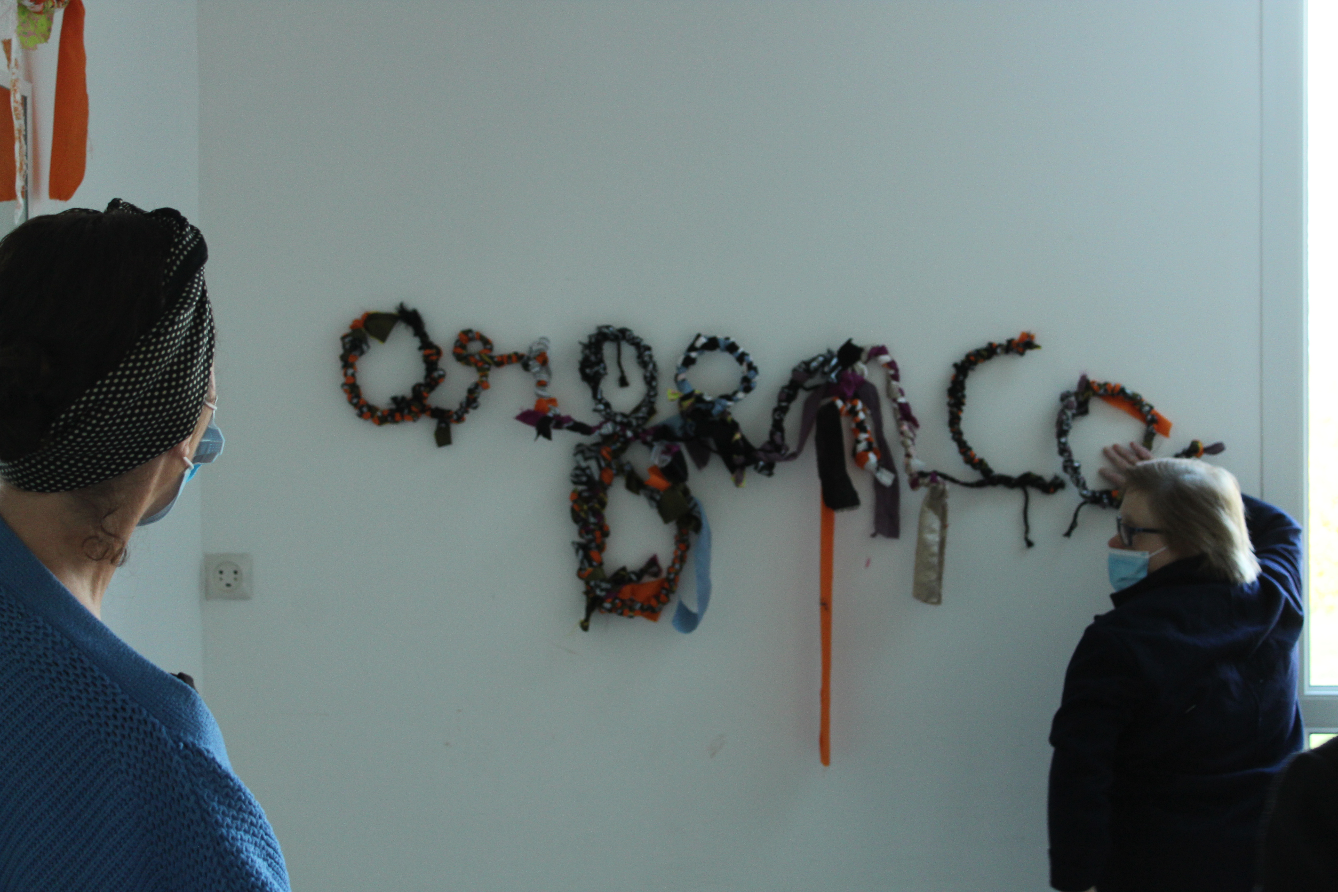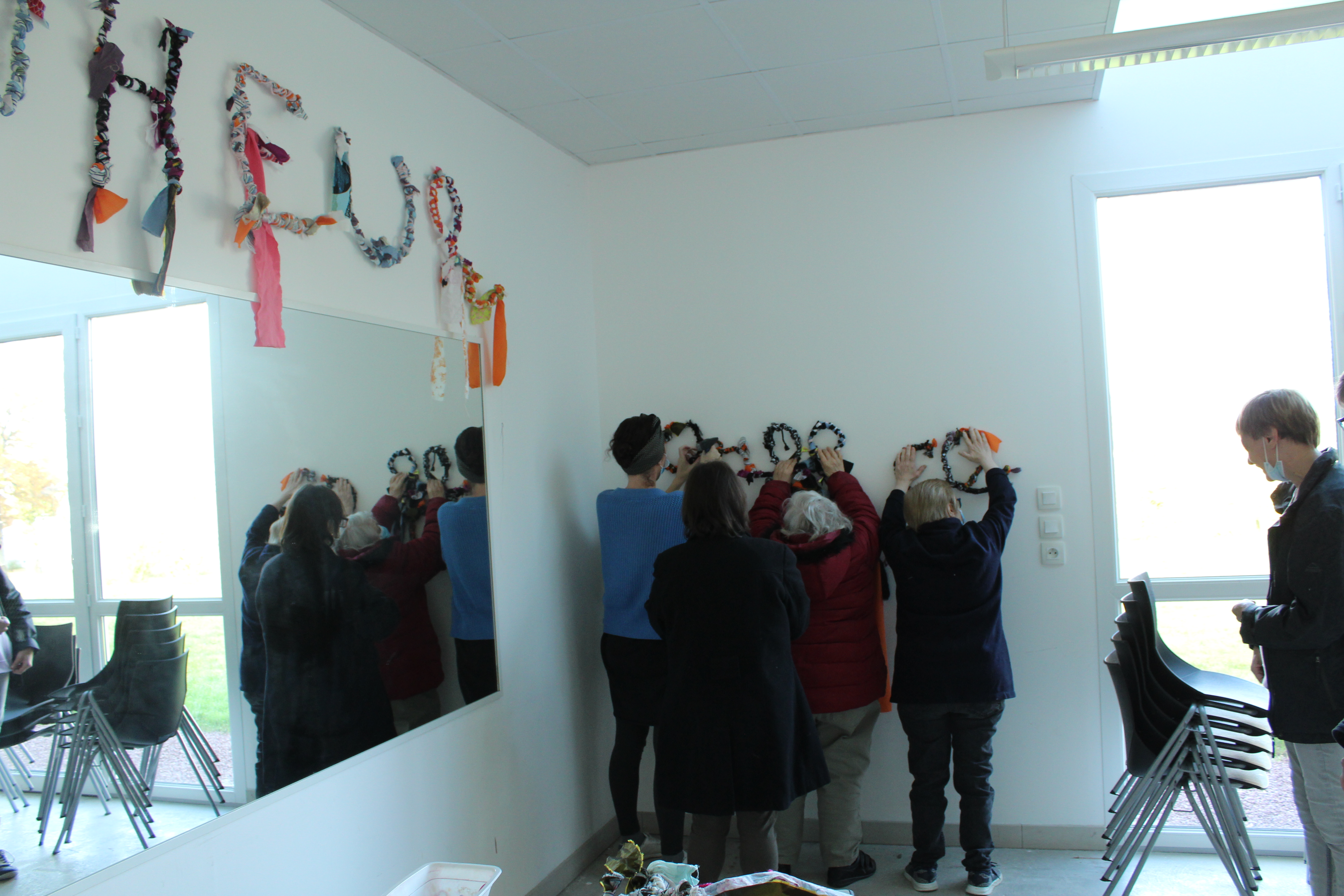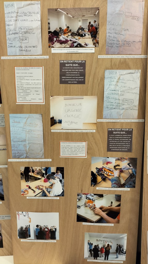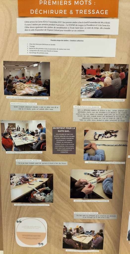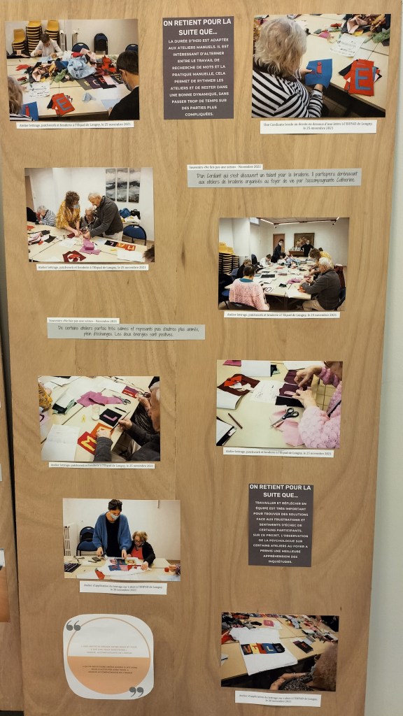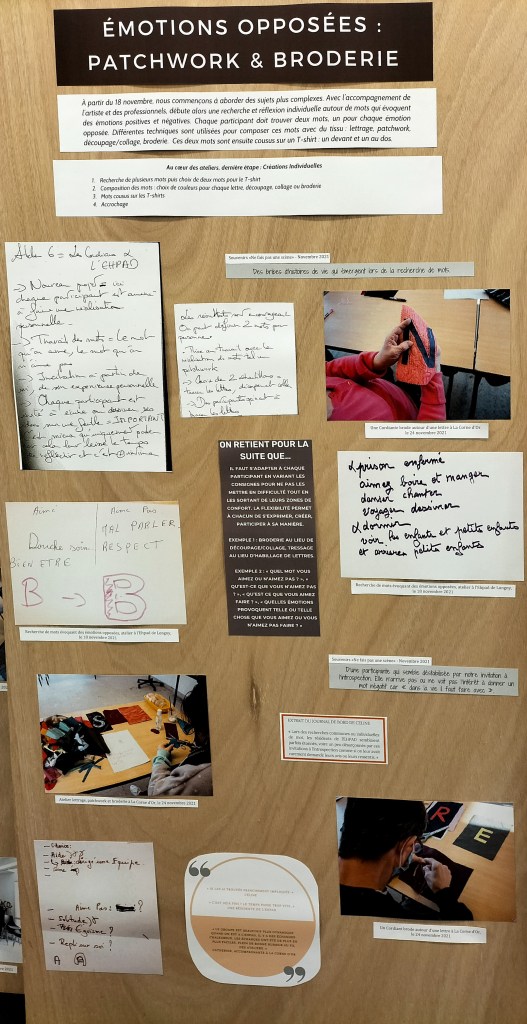 - 12 ateliers de broderie et maniement du tissu en général avec Céline Tuloup pour 6 Cordiants et 8 résidents d’EHPAD dont quelques abandons. La restitution de leur travail final (tee-shirts avec un mot positif/un mot négatif selon devant/derrière) a été vue par toutes les personnes ayant visité l’exposition de Céline Tuloup mais exposée dans une salle différente (parcours de visite expo création – expo médiation – expo des traces).