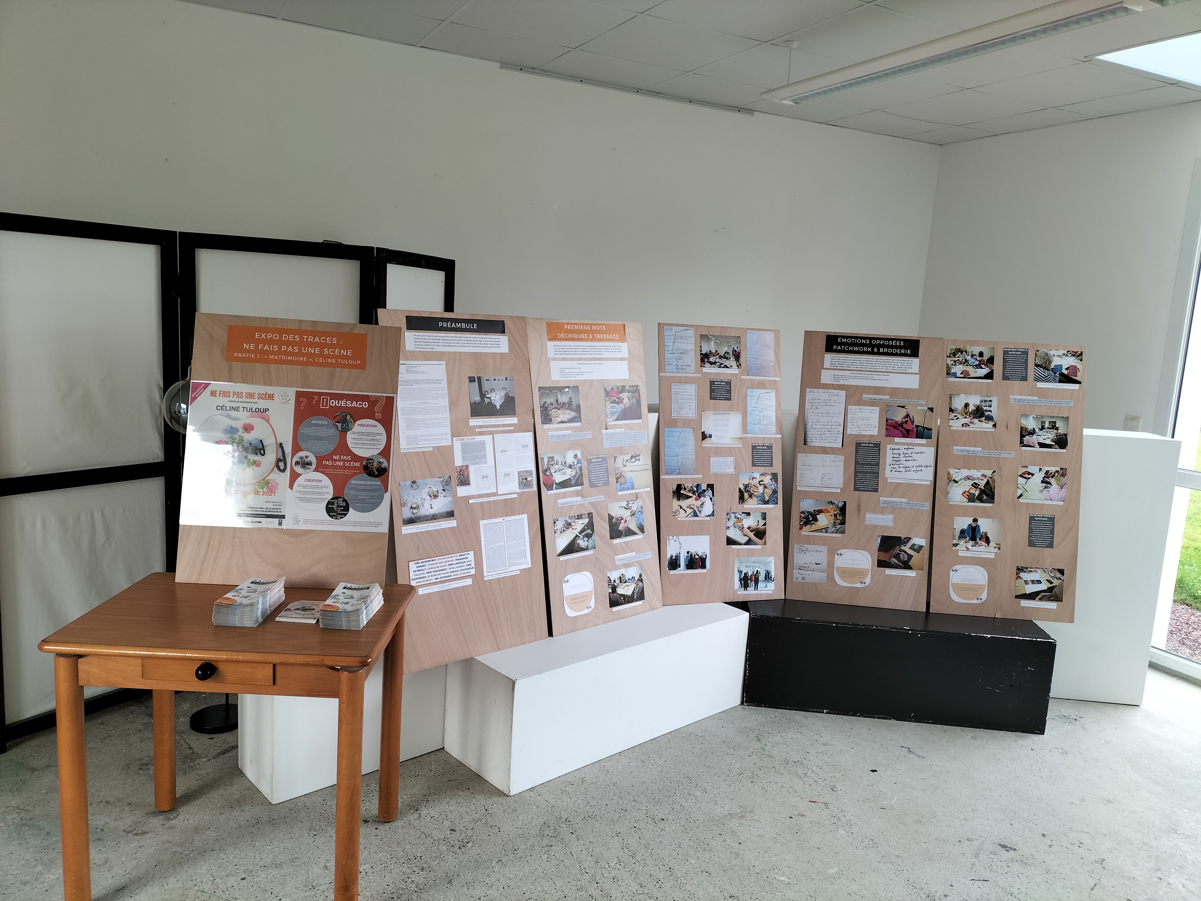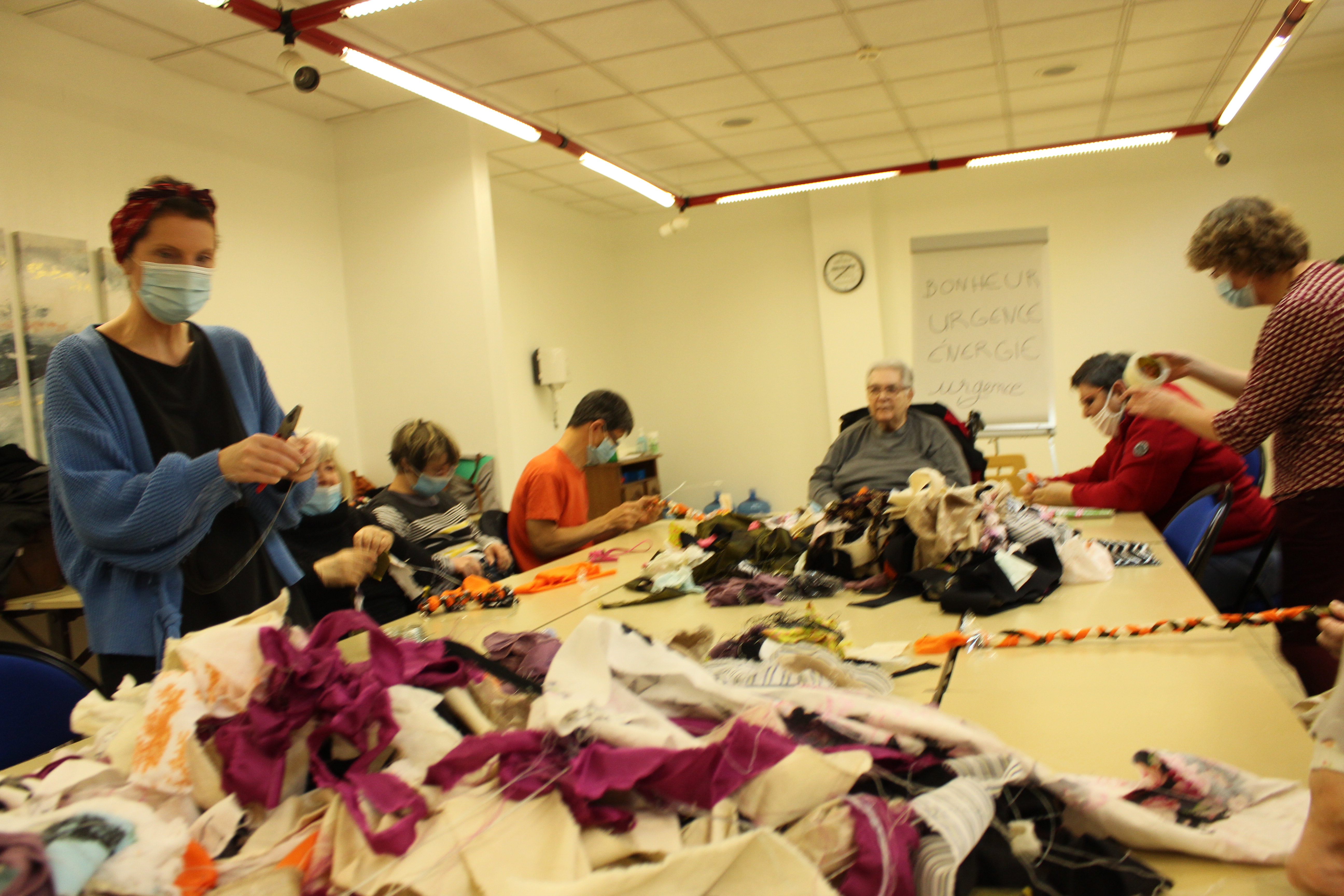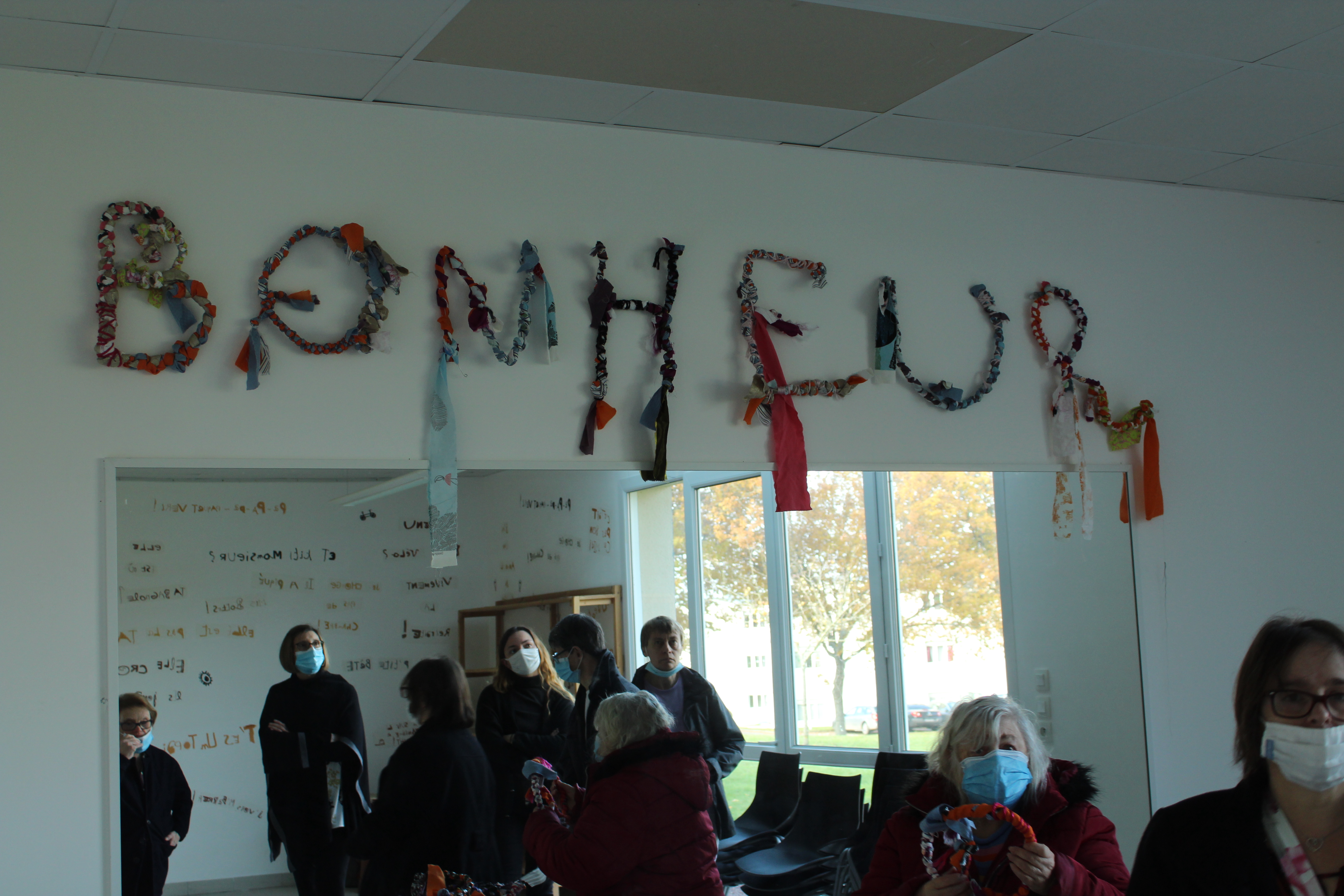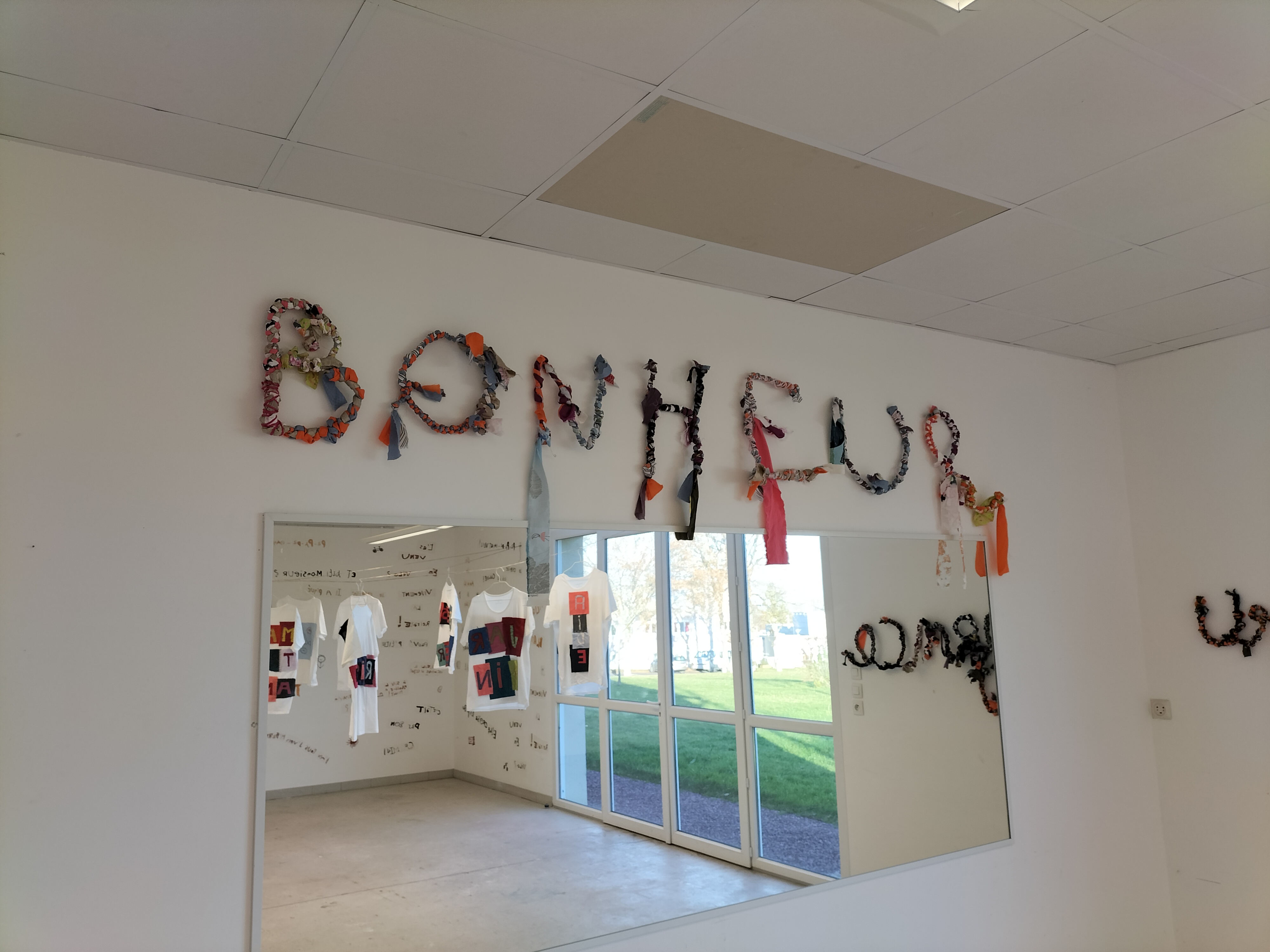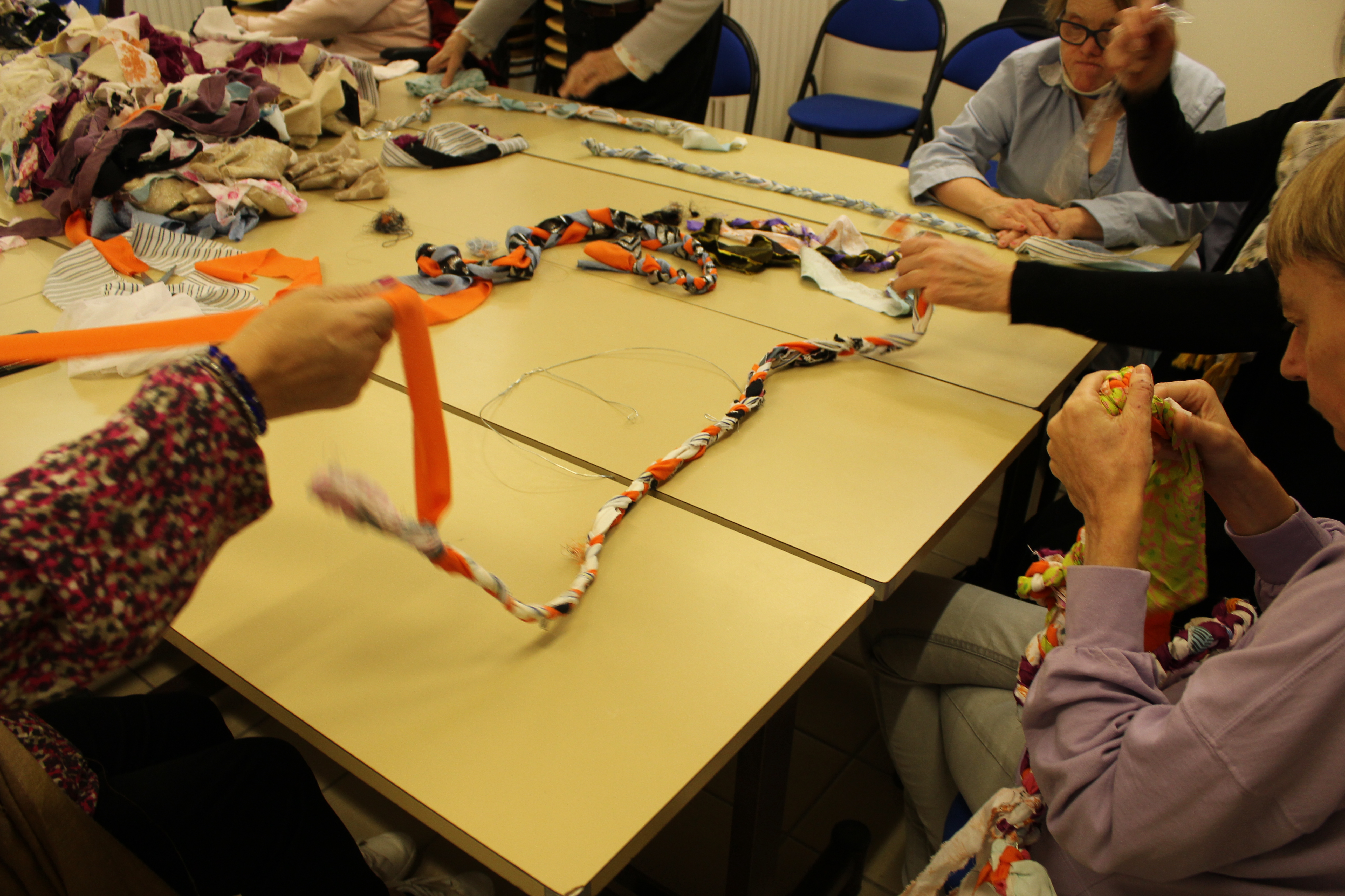 - 12 ateliers de broderie et maniement du tissu en général avec Céline Tuloup pour 6 Cordiants et 8 résidents d’EHPAD dont quelques abandons. La restitution de leur travail final (tee-shirts avec un mot positif/un mot négatif selon devant/derrière) a été vue par toutes les personnes ayant visité l’exposition de Céline Tuloup mais exposée dans une salle différente (parcours de visite expo création – expo médiation – expo des traces).