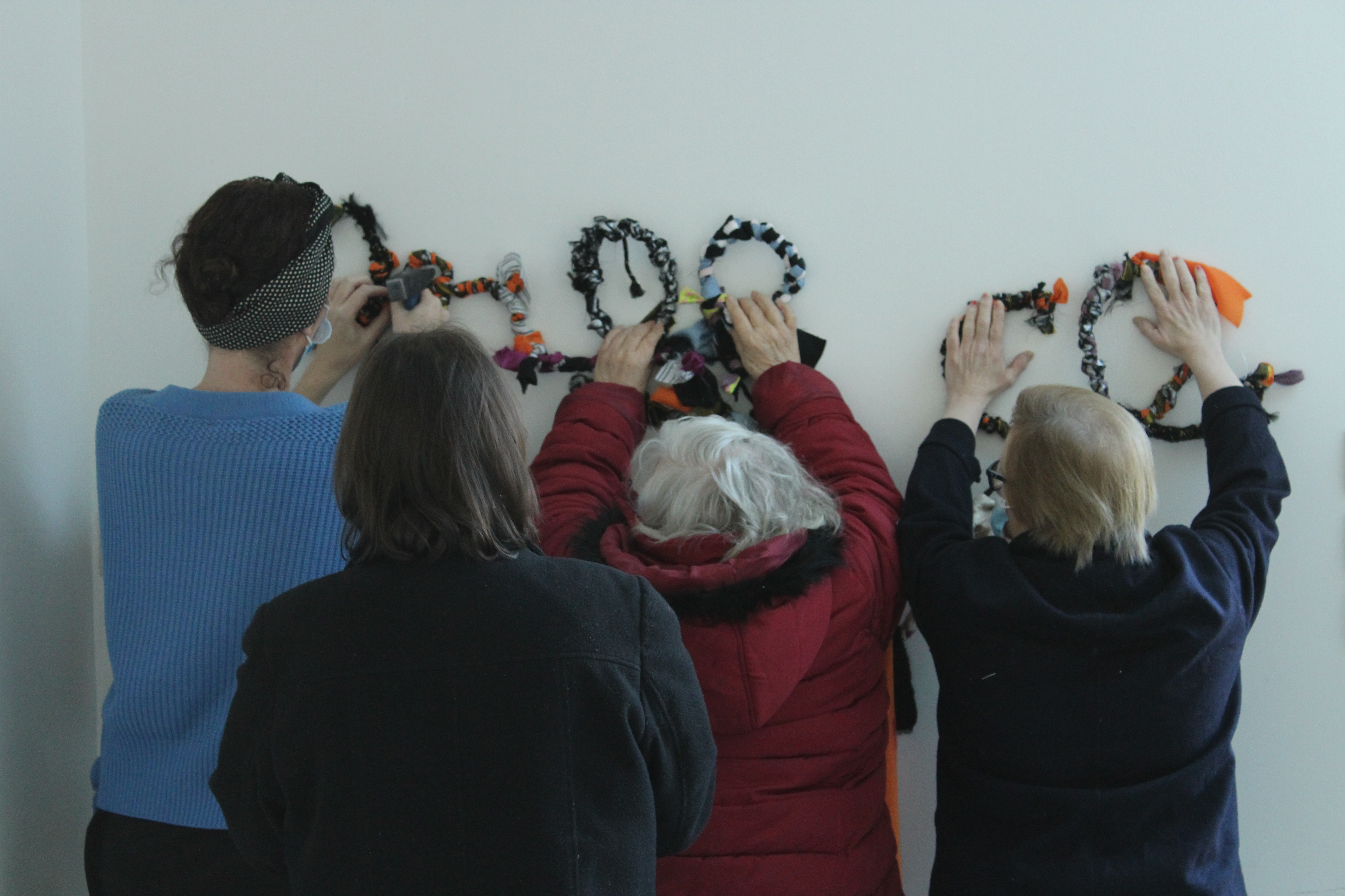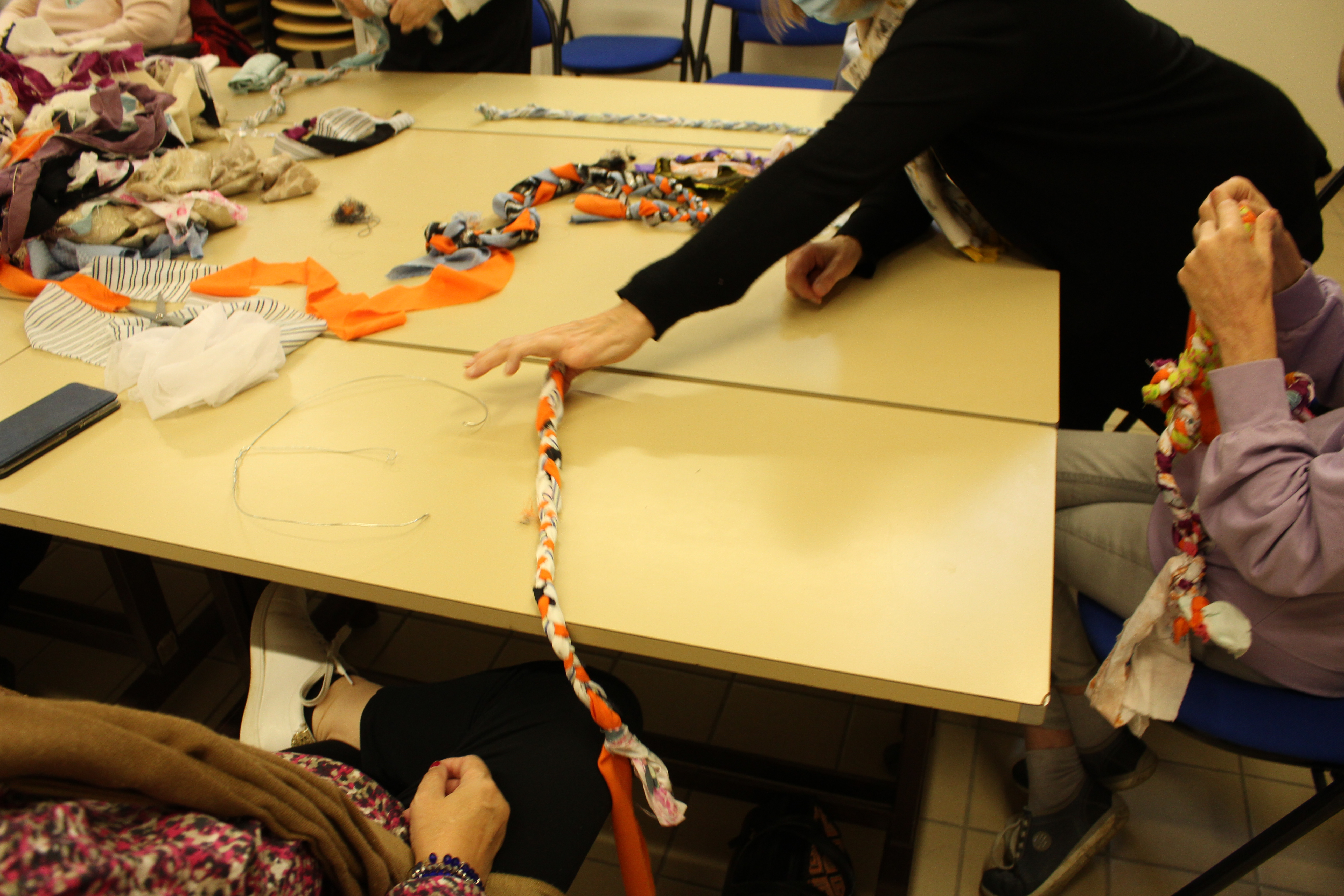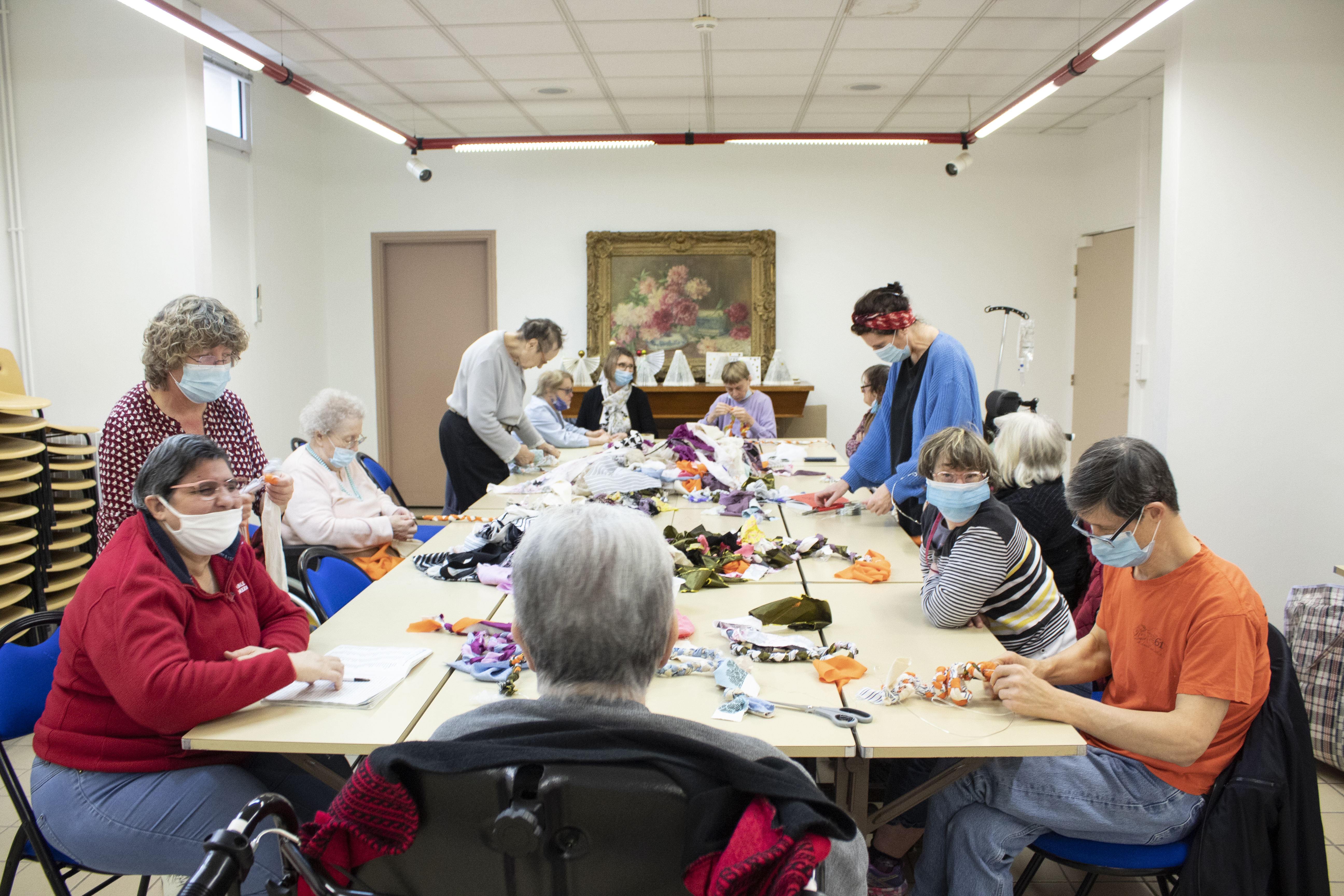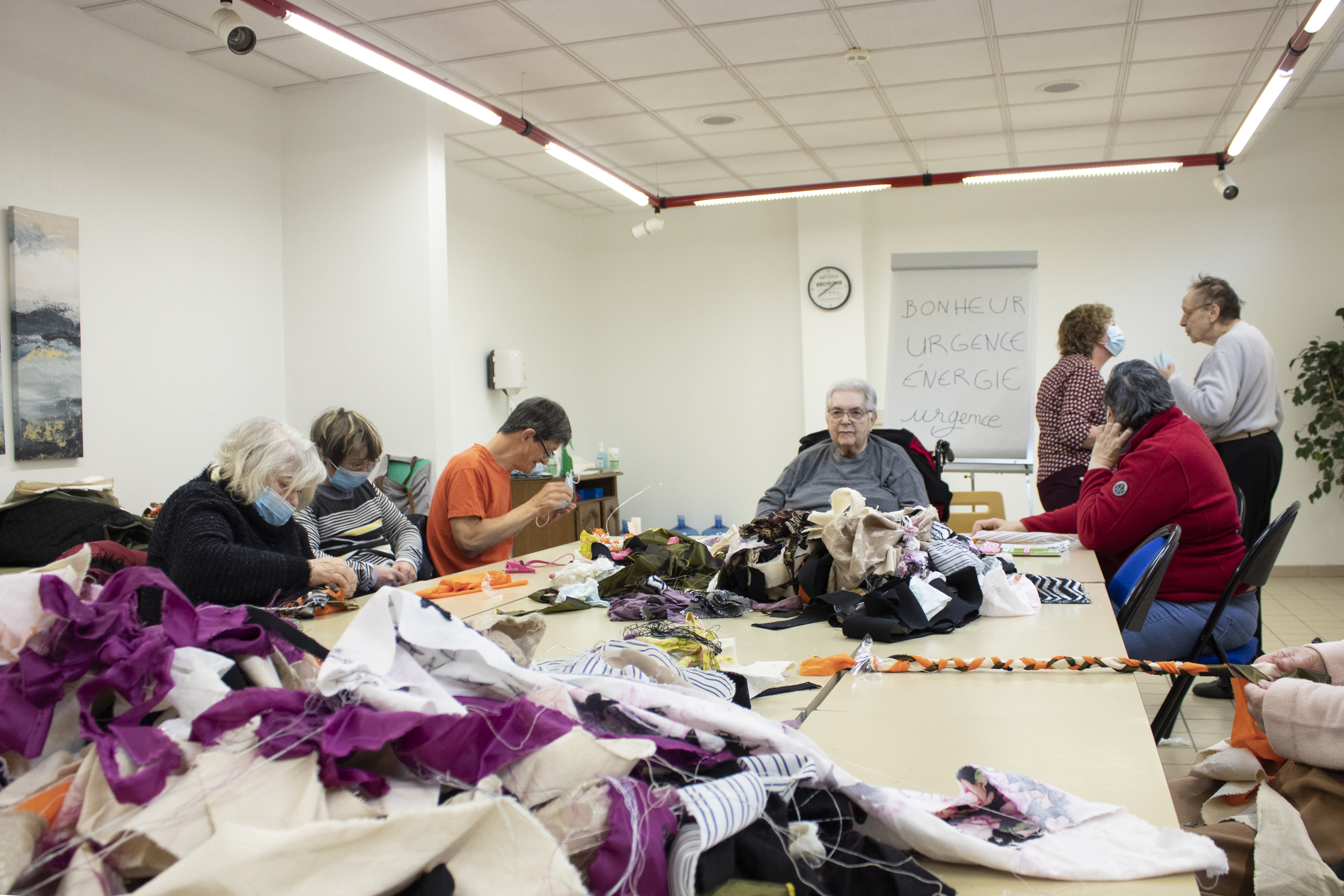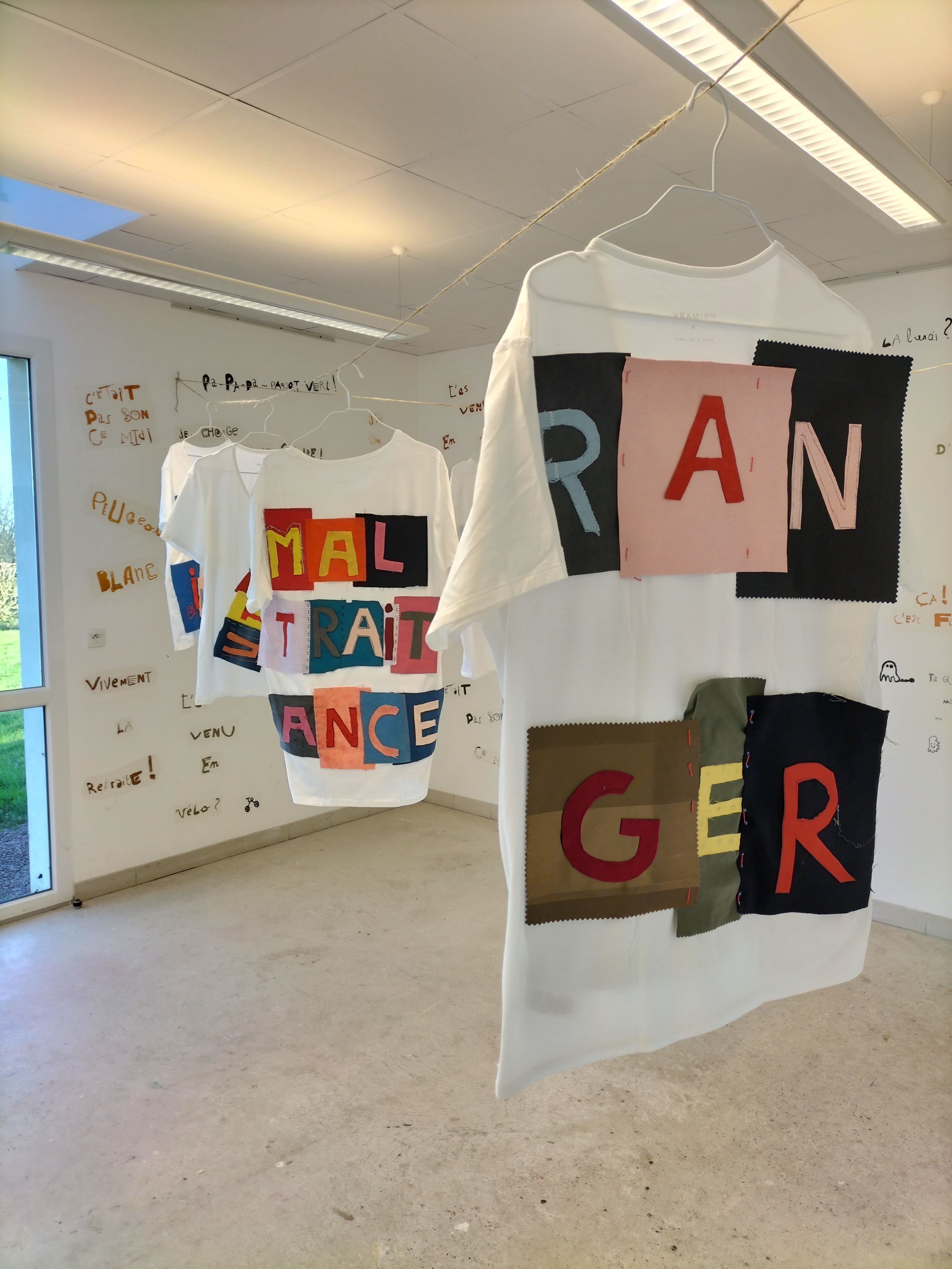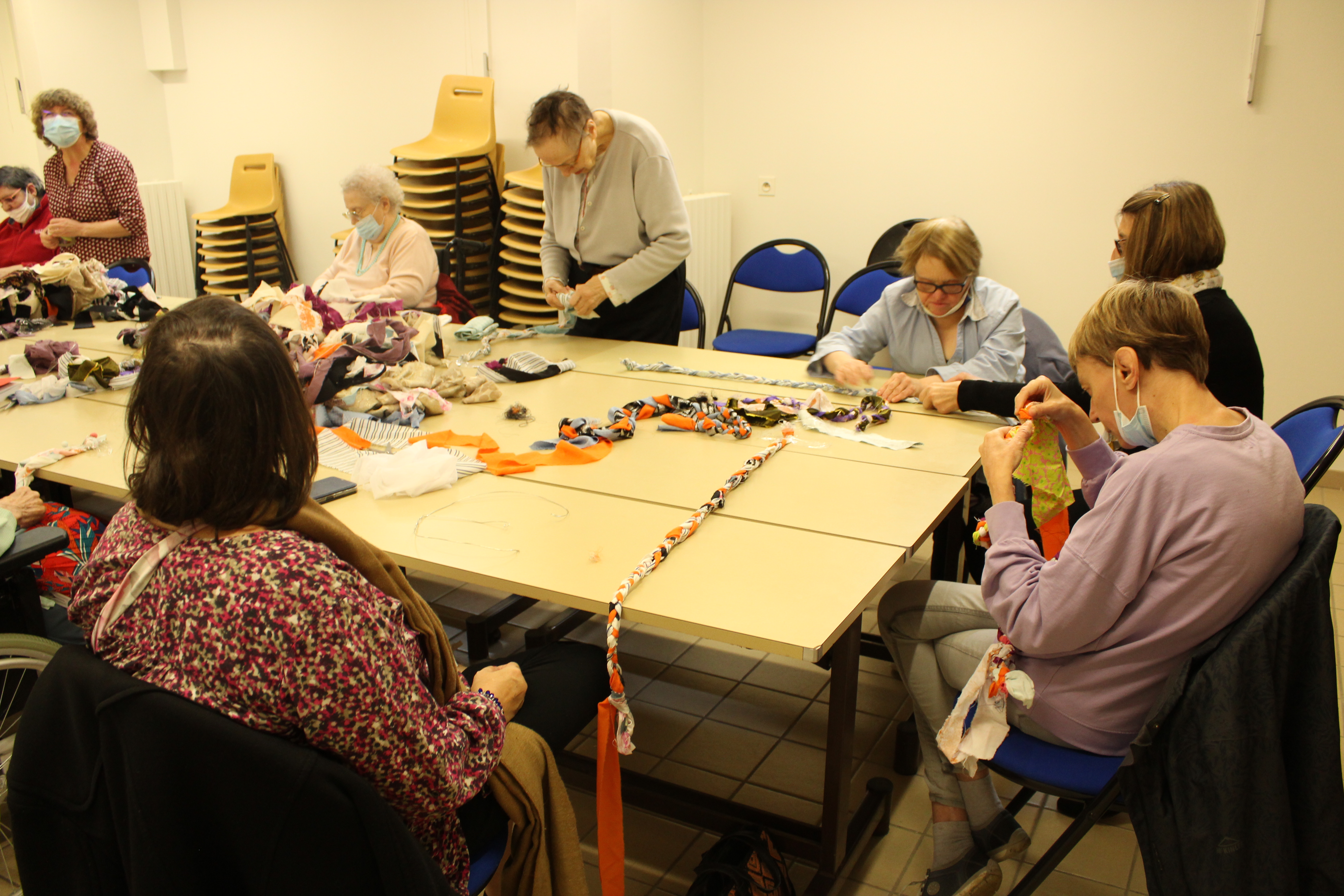 - 12 ateliers de broderie et maniement du tissu en général avec Céline Tuloup pour 6 Cordiants et 8 résidents d’EHPAD dont quelques abandons. La restitution de leur travail final (tee-shirts avec un mot positif/un mot négatif selon devant/derrière) a été vue par toutes les personnes ayant visité l’exposition de Céline Tuloup mais exposée dans une salle différente (parcours de visite expo création – expo médiation – expo des traces).