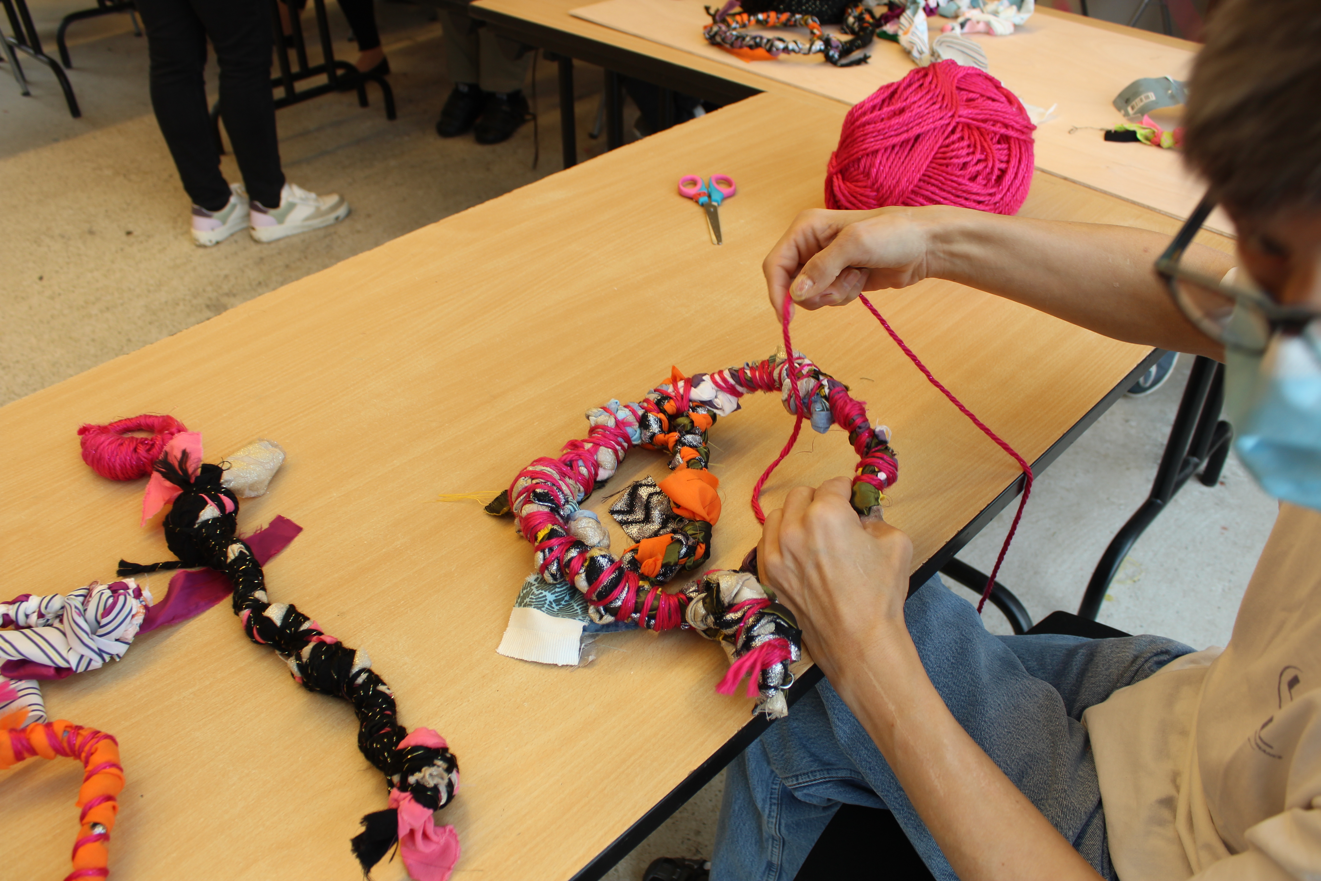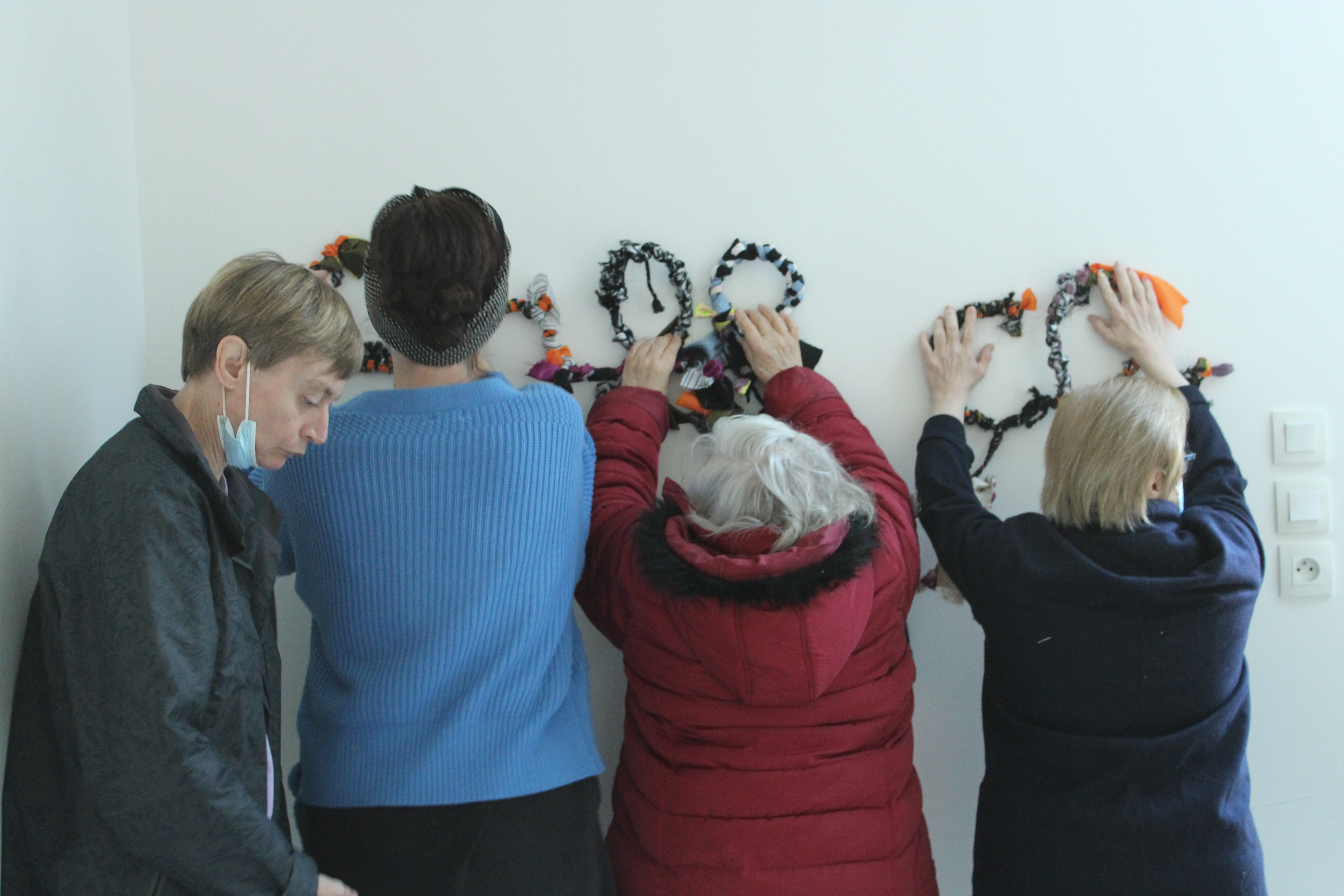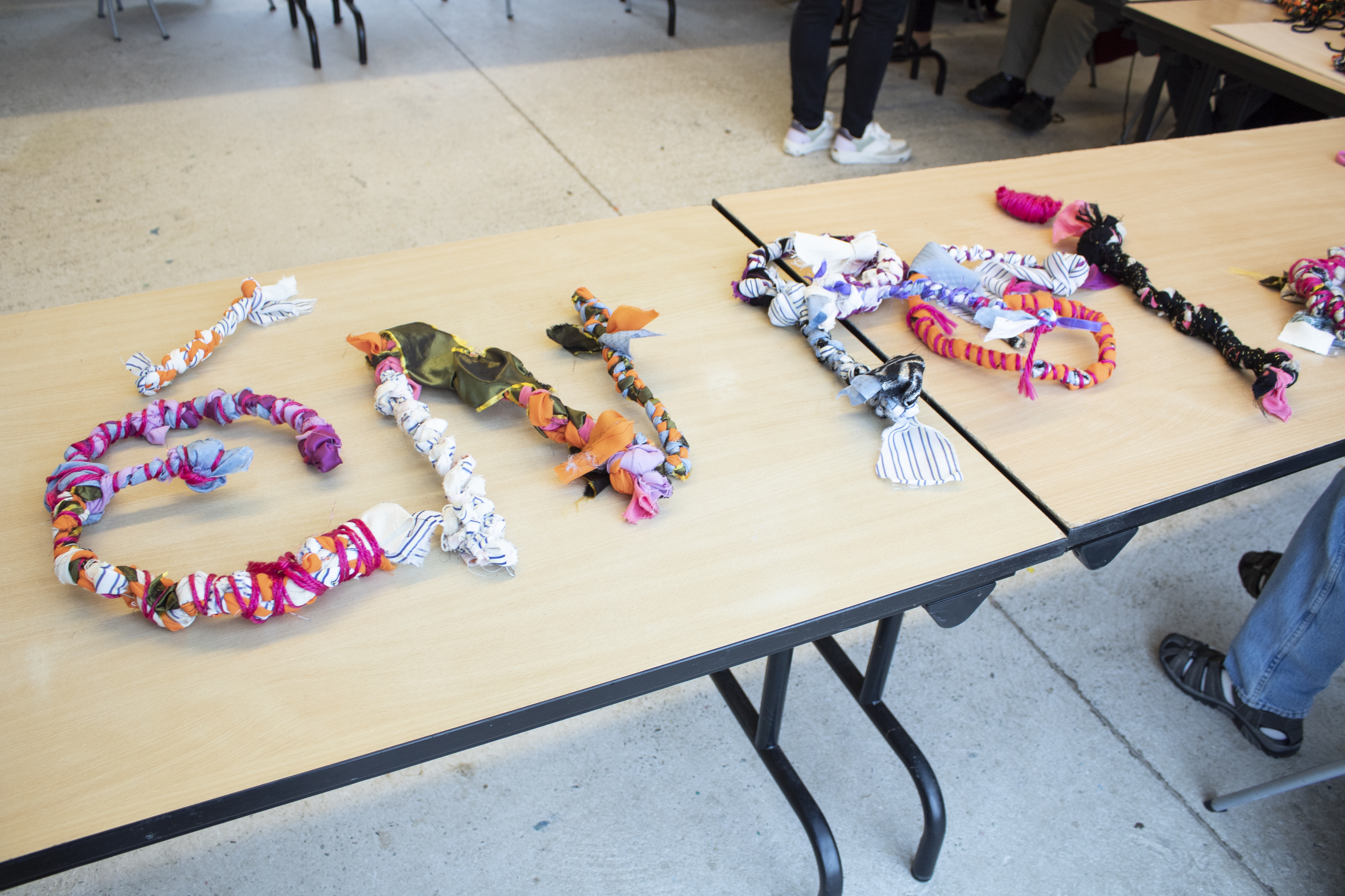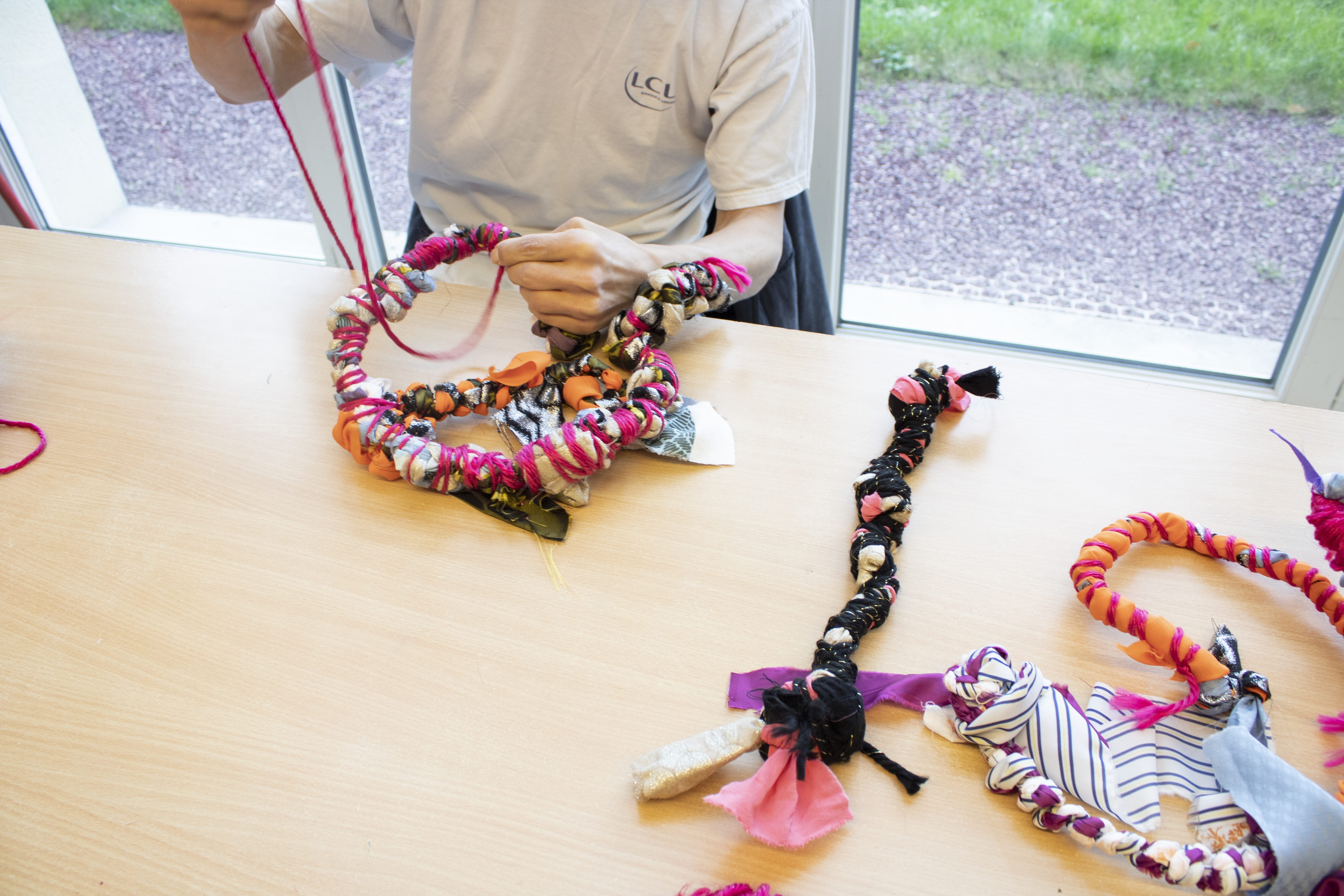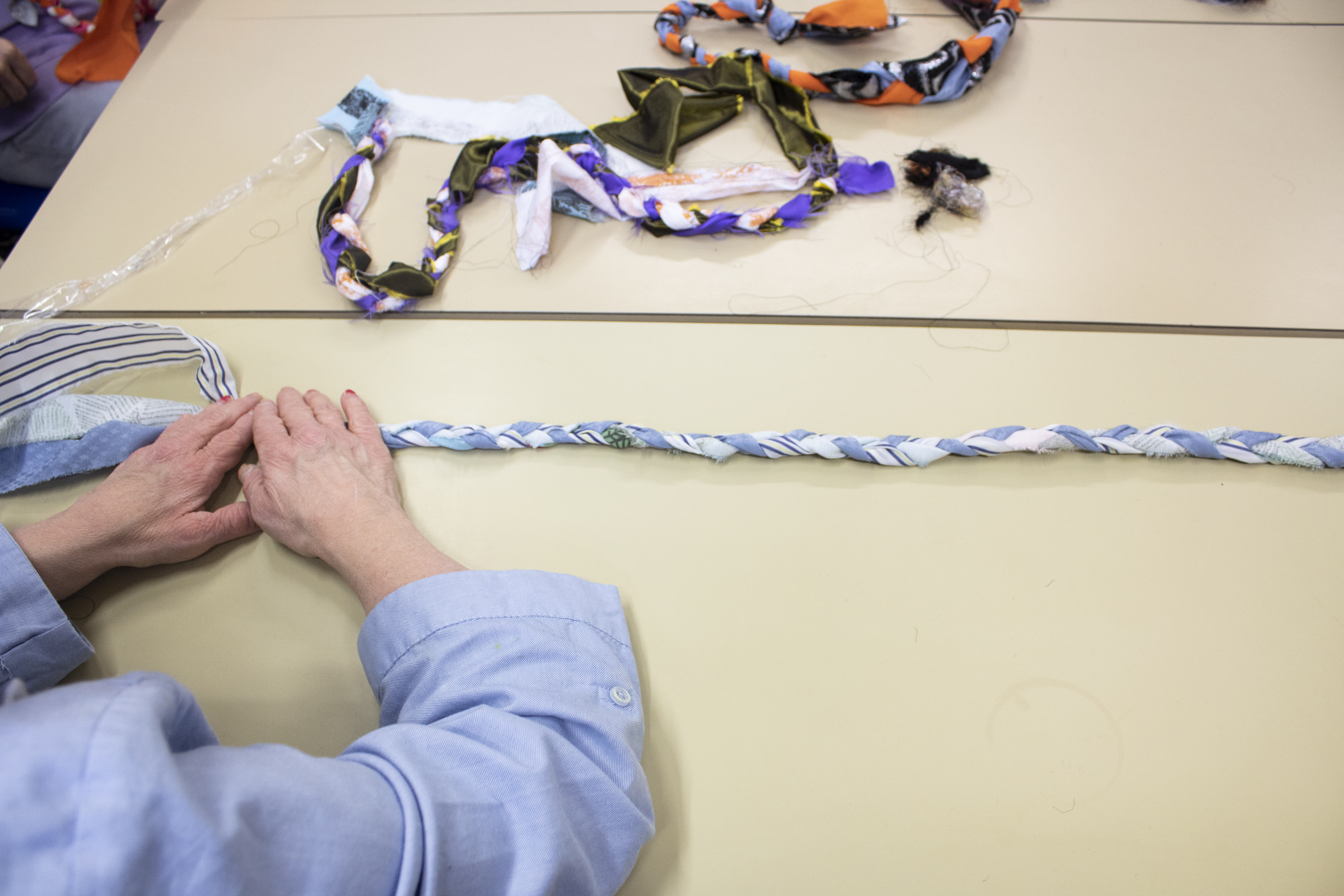- 12 ateliers de broderie et maniement du tissu en général avec Céline Tuloup pour 6 Cordiants et 8 résidents d’EHPAD dont quelques abandons. La restitution de leur travail final (tee-shirts avec un mot positif/un mot négatif selon devant/derrière) a été vue par toutes les personnes ayant visité l’exposition de Céline Tuloup mais exposée dans une salle différente (parcours de visite expo création – expo médiation – expo des traces).