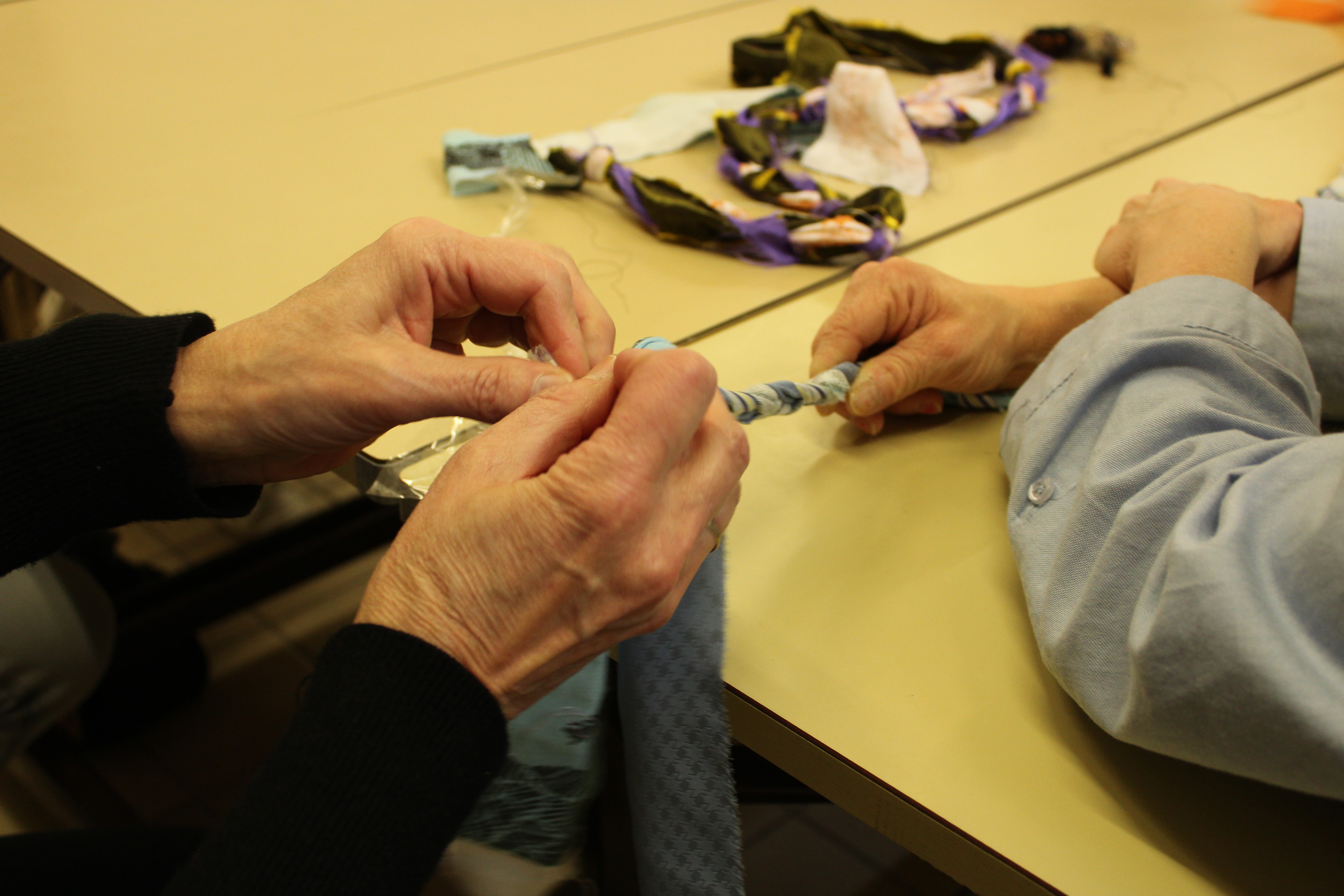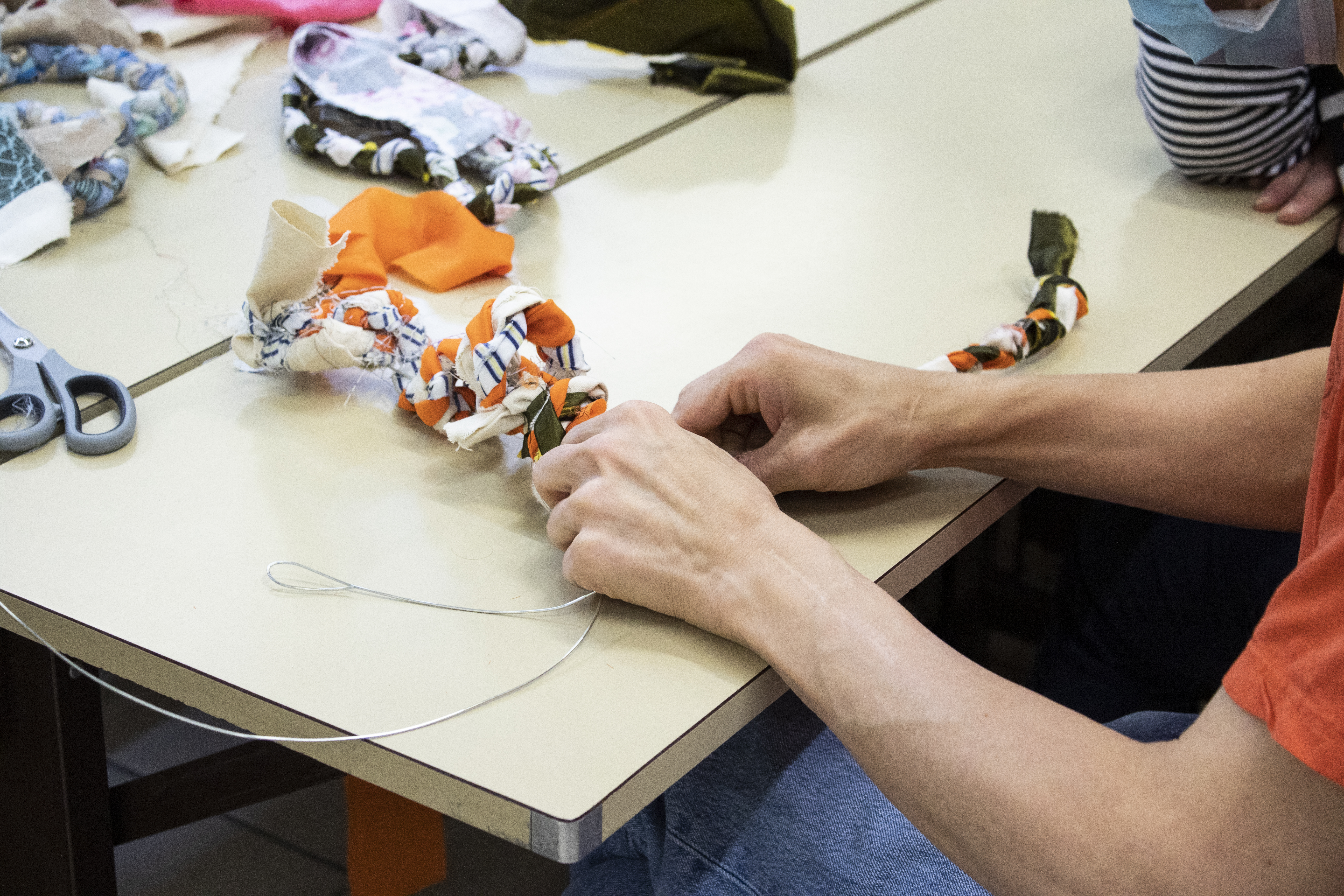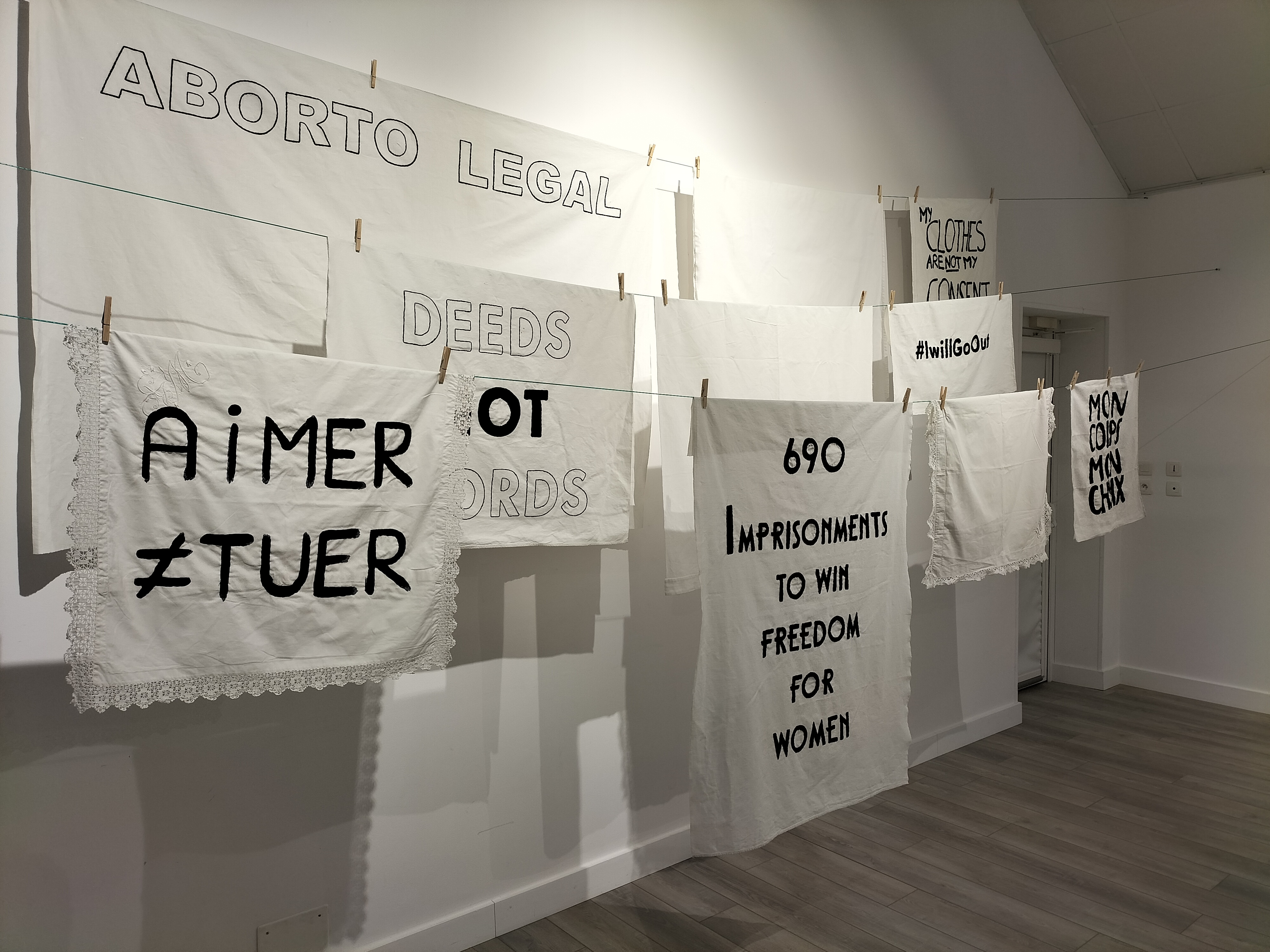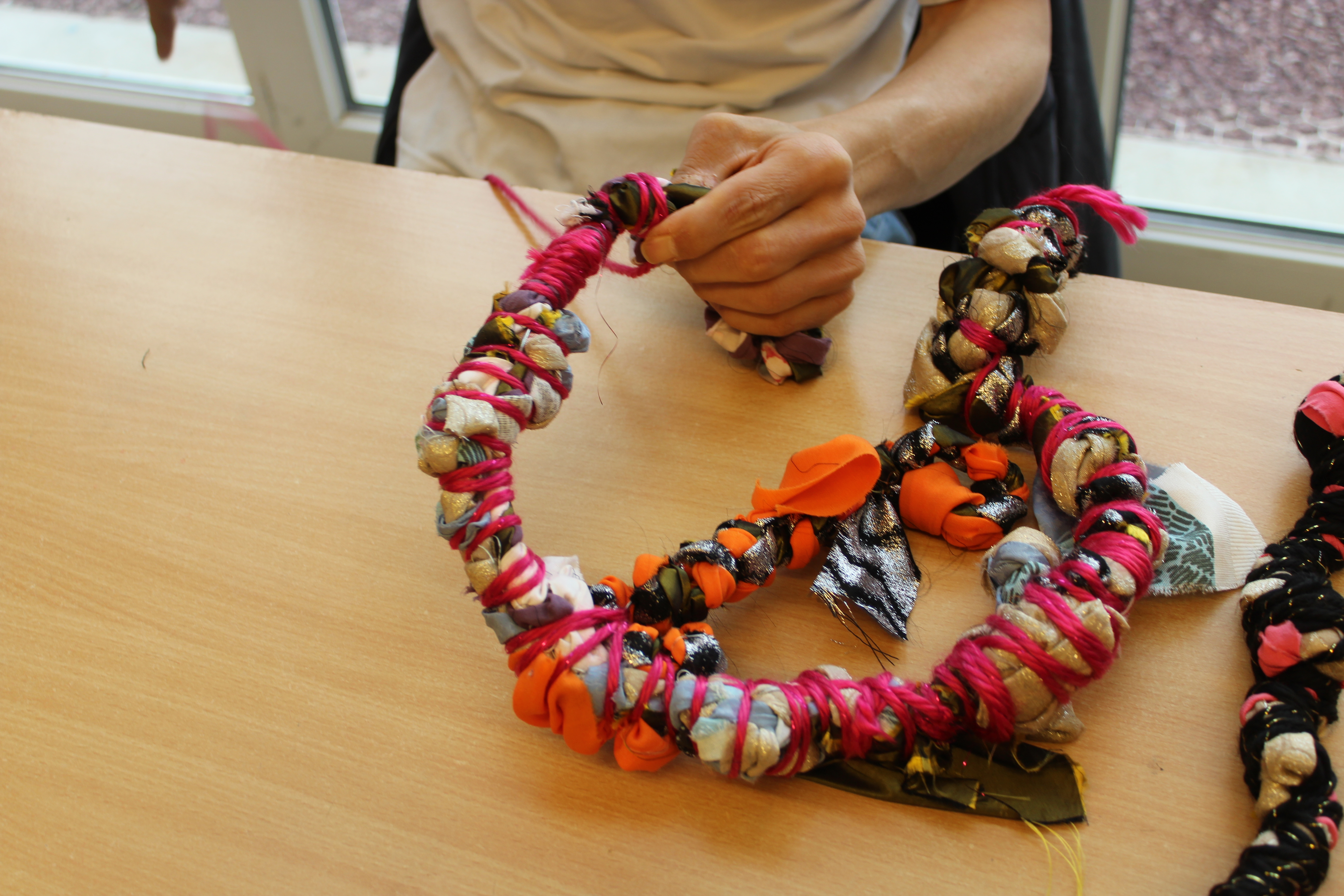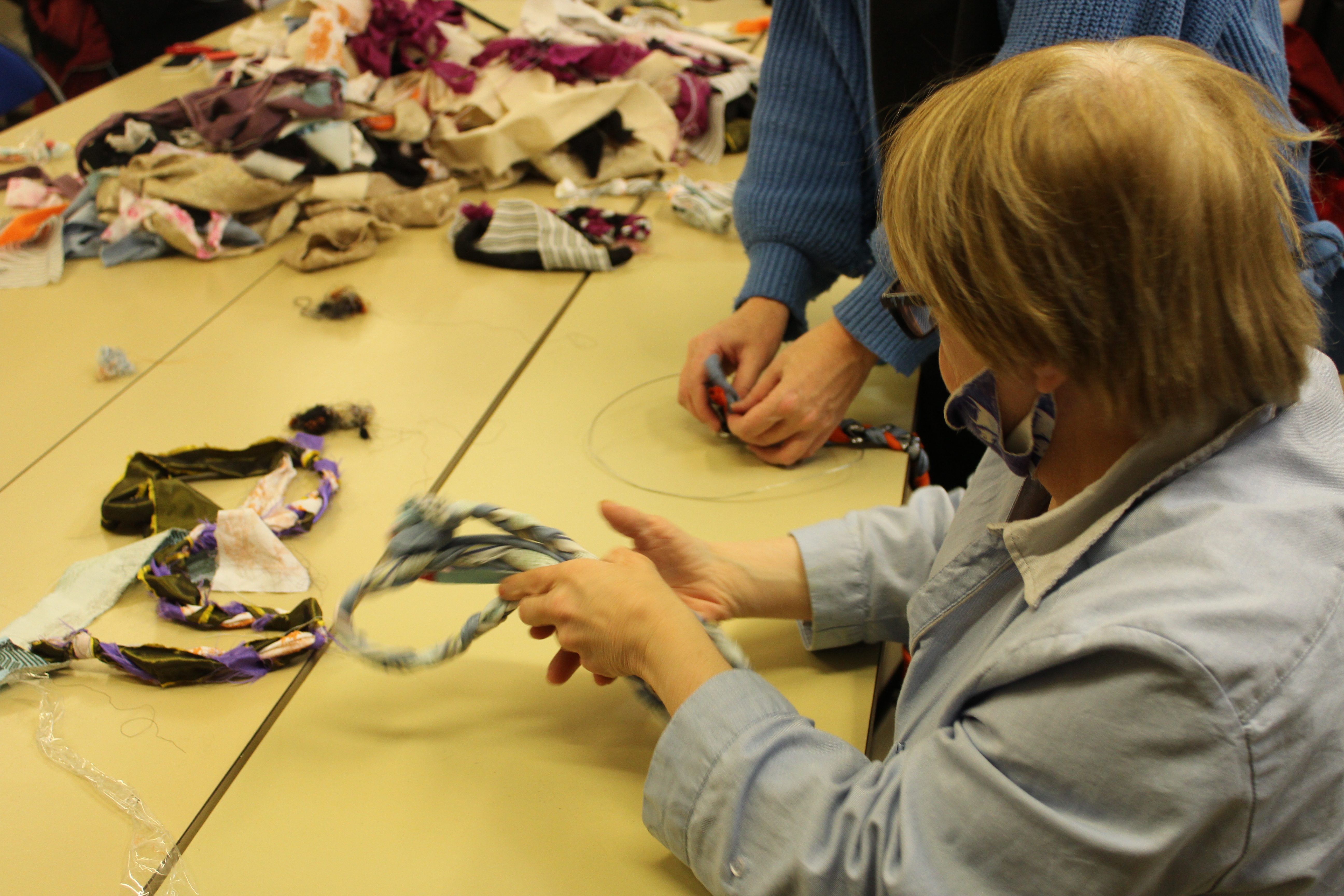 - 12 ateliers de broderie et maniement du tissu en général avec Céline Tuloup pour 6 Cordiants et 8 résidents d’EHPAD dont quelques abandons. La restitution de leur travail final (tee-shirts avec un mot positif/un mot négatif selon devant/derrière) a été vue par toutes les personnes ayant visité l’exposition de Céline Tuloup mais exposée dans une salle différente (parcours de visite expo création – expo médiation – expo des traces).